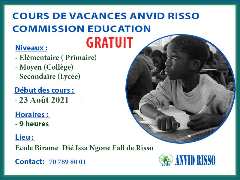 Dans le cadre de ses activités éducatives, l’Association Nouvelle Vision pour le Développement de RISSO (ANVID), vous fait part des cours de vacances qu’elle compte organiser pour les élèves du primaire, collège et lycée à partir du lundi 23 Aout 2021 à 9 heures à l’école BIRAME DIE ISSA NGONE FALL.