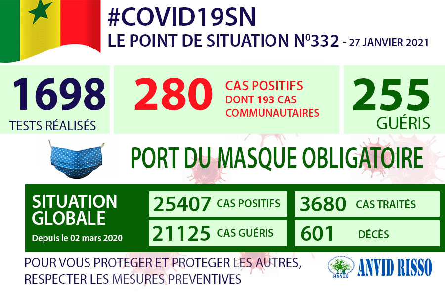 Elles sont constituées de 87 cas contacts déjà suivis par les services sanitaires et de 193 contaminations issues de la transmission communautaire, a précisé M. Guèye. Aucun cas importé de Covid-19 n’a été signalé.